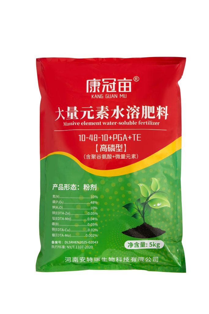 康冠亩大量元素高磷型水溶肥10-48-10+PGA+TE是河南安特瑞生物科技有限公司为作物生根、促花、坐果期研发的高磷型全水溶肥料。